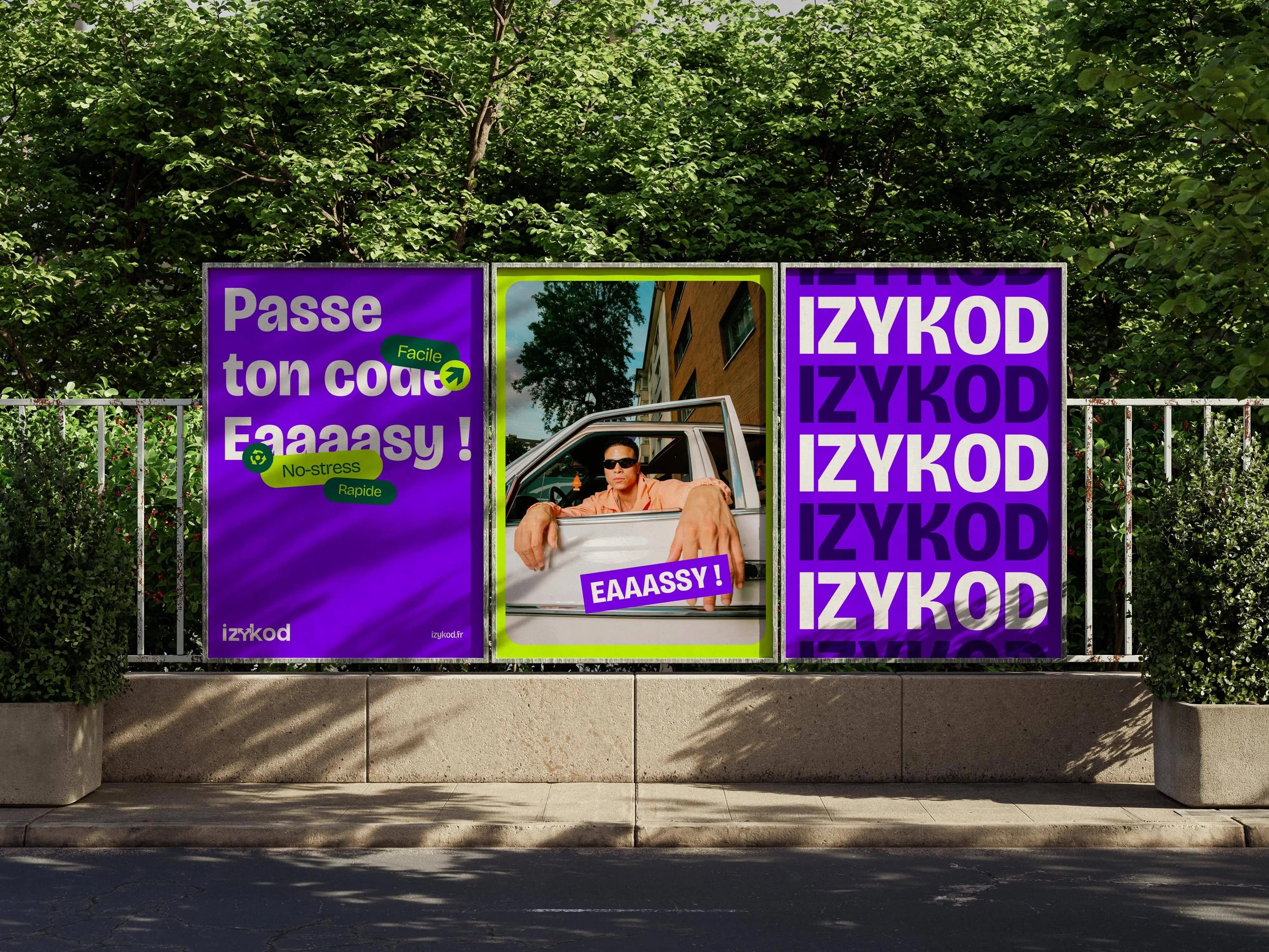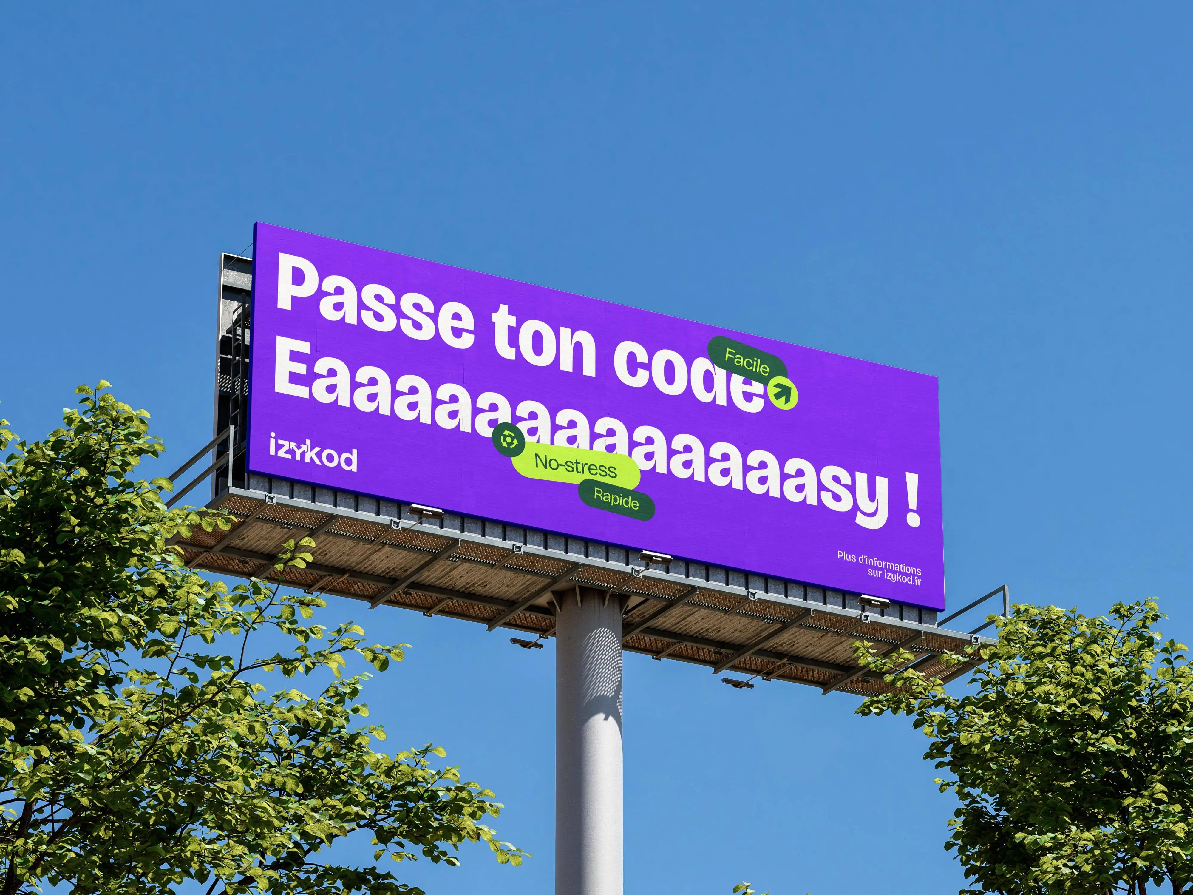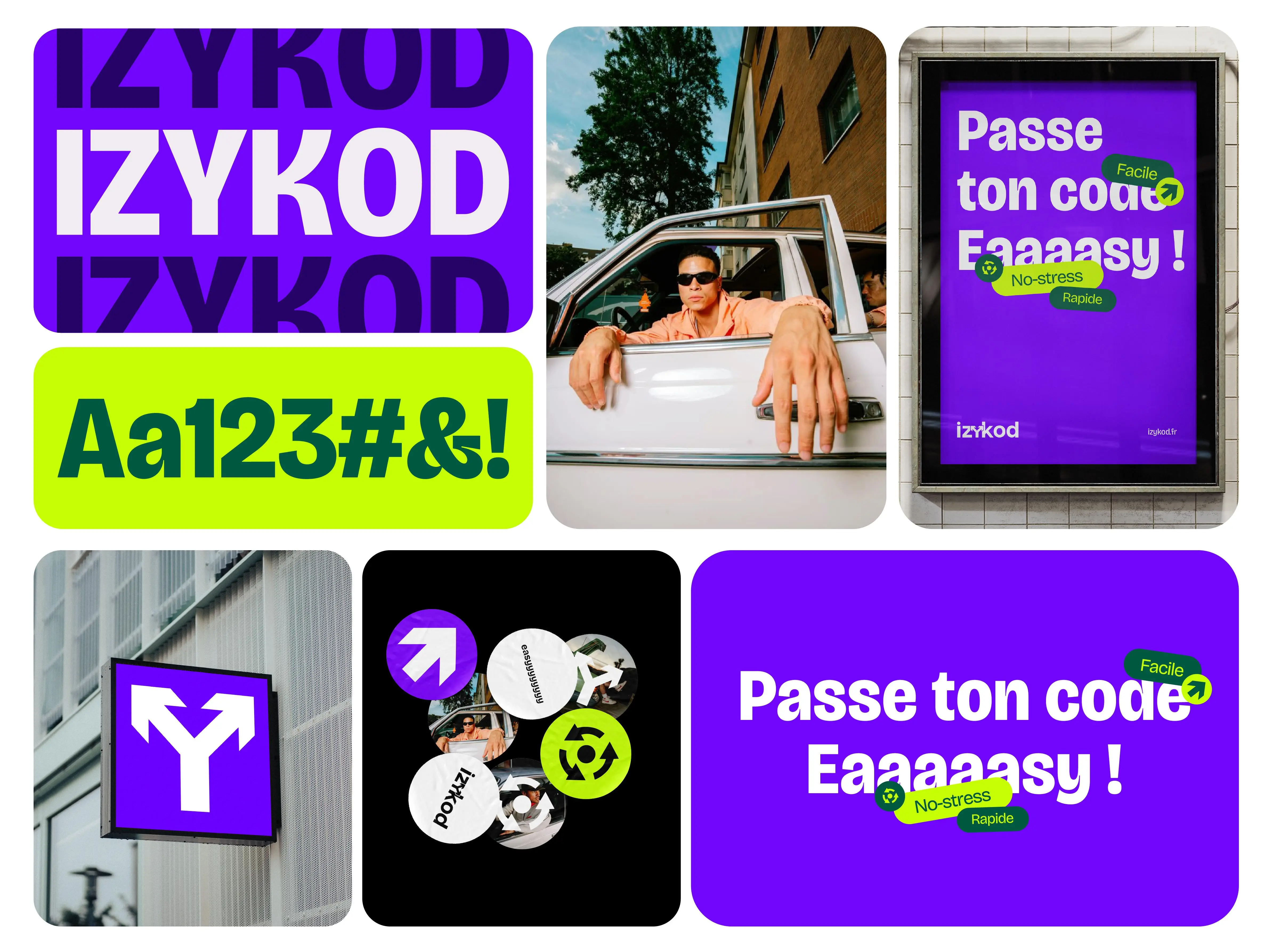 Nous avons conçu une identité énergique, ludique, claire, à l’image de la promesse d’Izykod : passer son code, facilement, en toute liberté, partout.