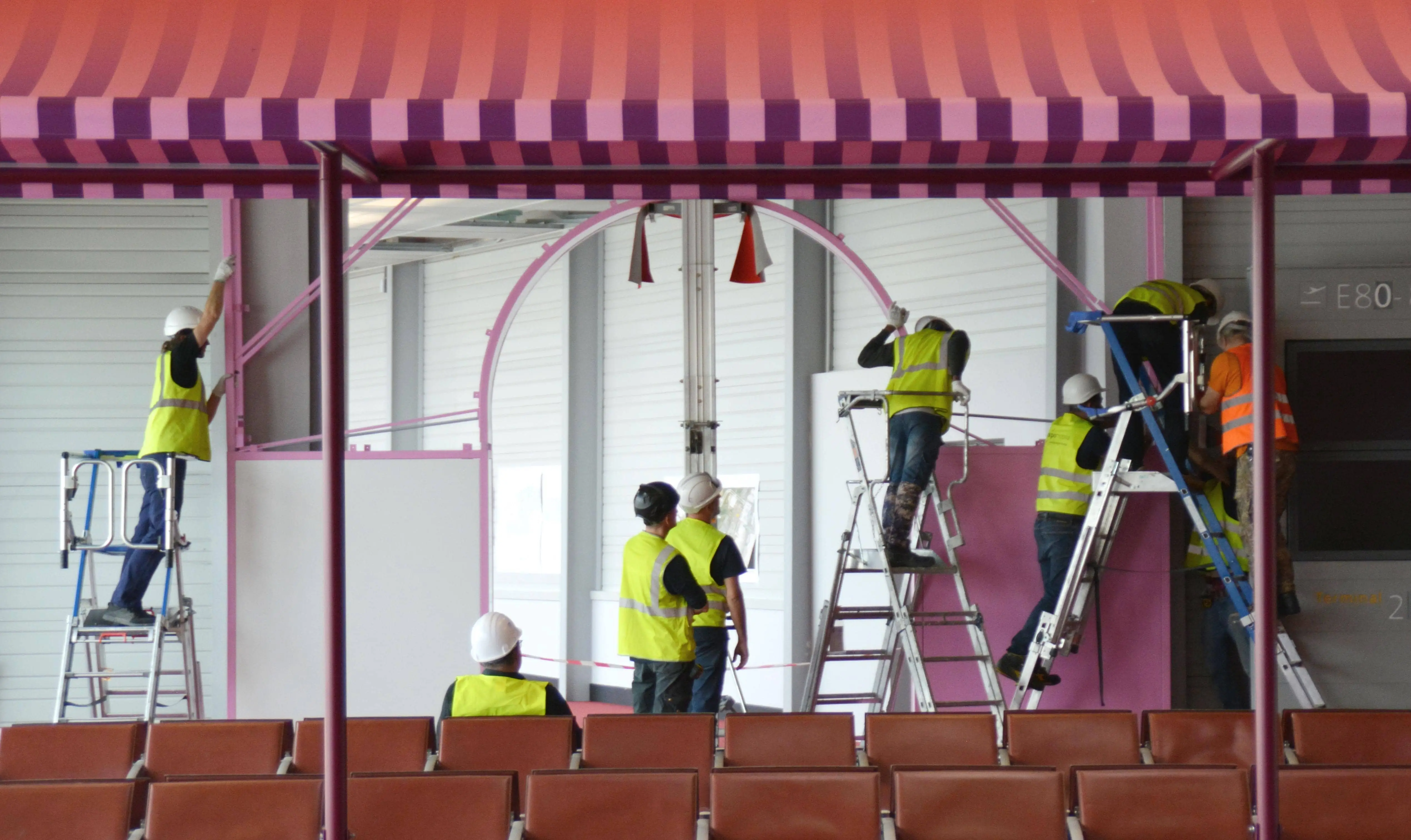 La scénographie se fait ville : bancs, pavés, enseignes, typographies, éléments de mobilier. Une Paris sensorielle, transposée dans l’aéroport, espace fonctionnel par excellence.