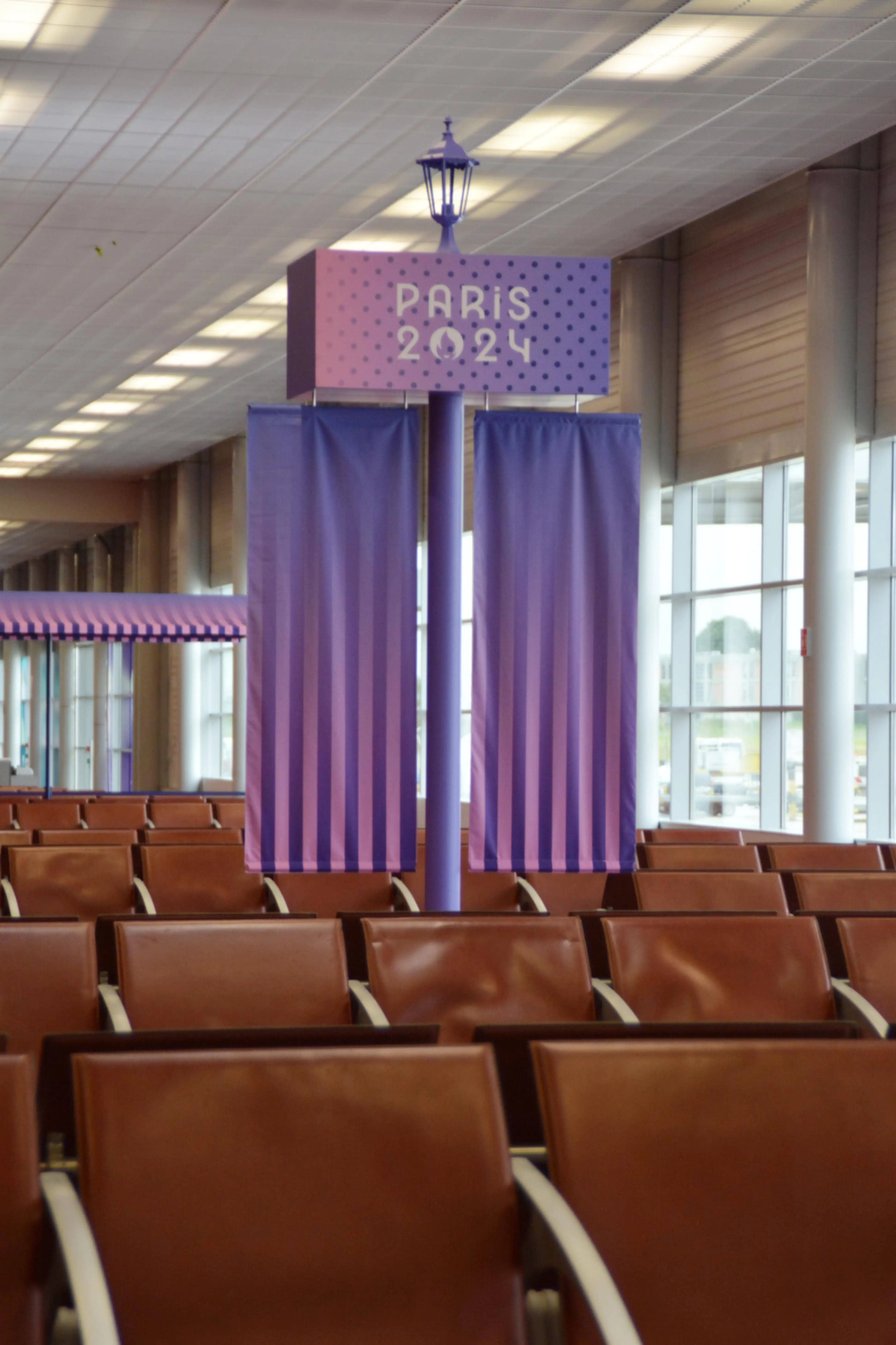 L’objectif était de créer un espace immersif destiné à accueillir les délégations sportives, les journalistes et les visiteurs du monde entier, à leur arrivée comme à leur départ, en incarnant l’esprit des JO dans un contexte aéroportuaire.