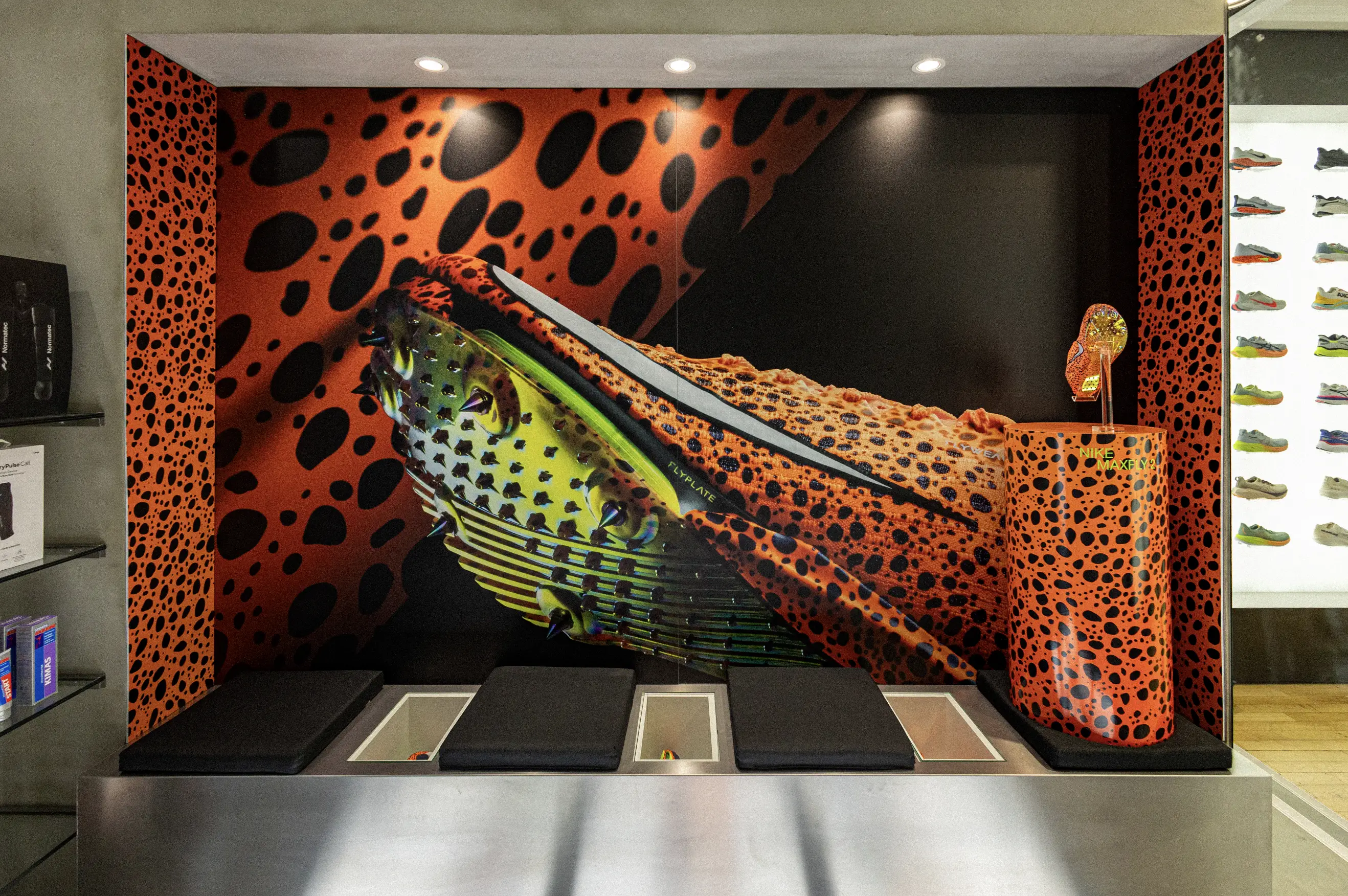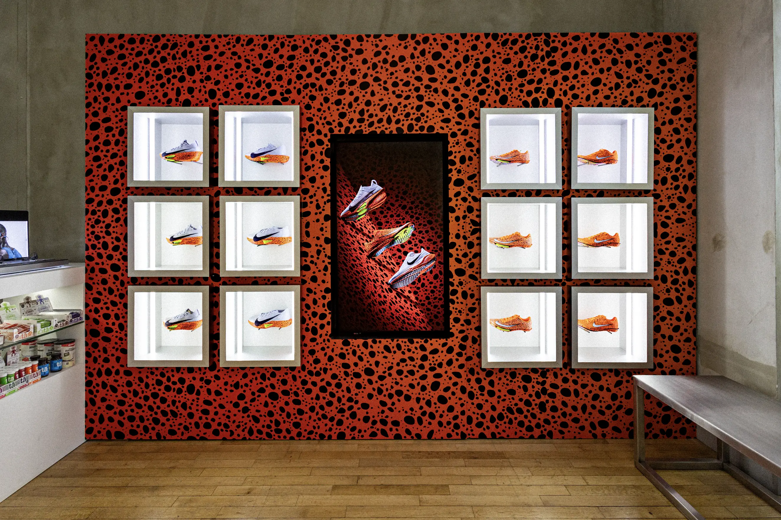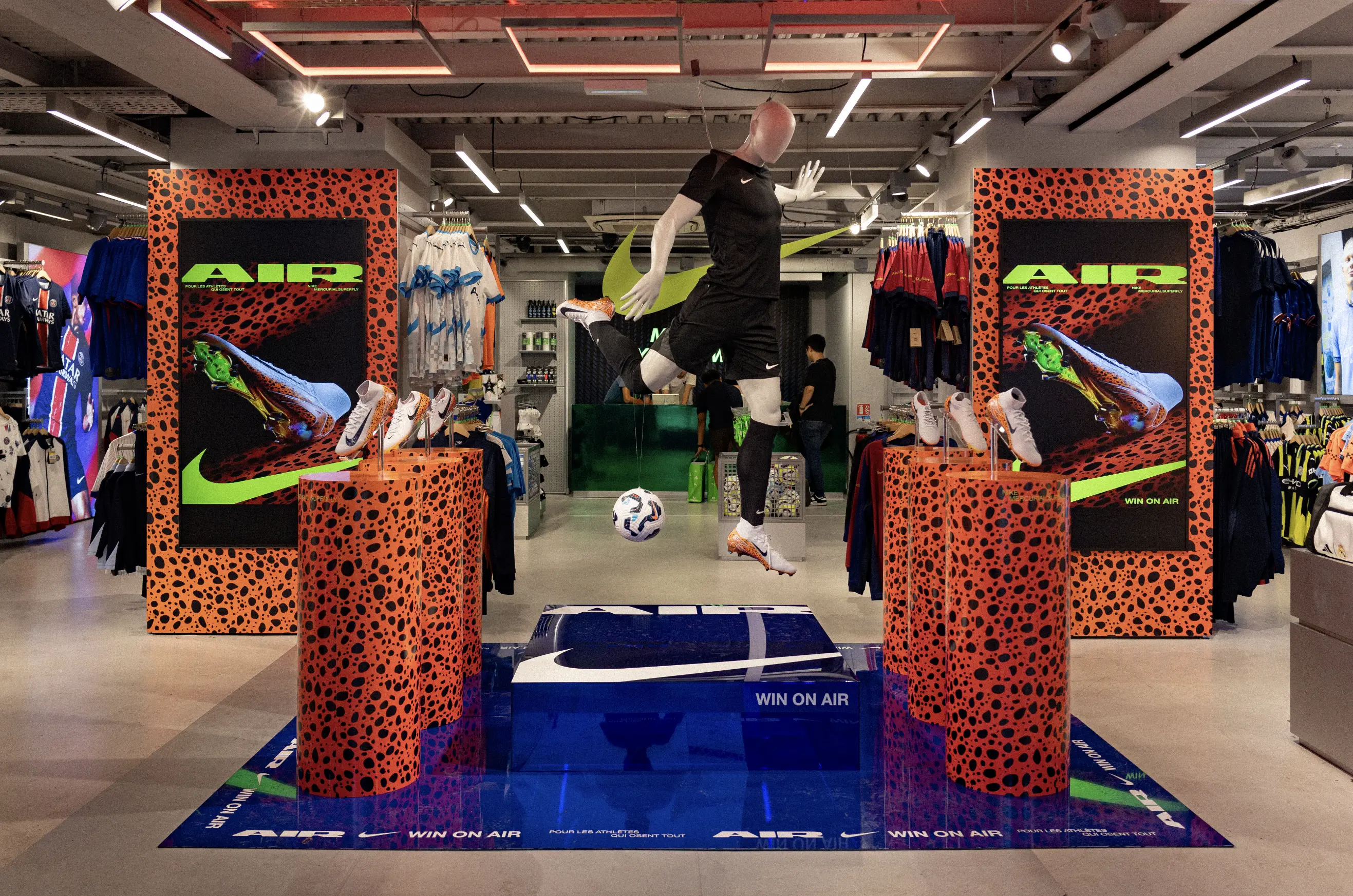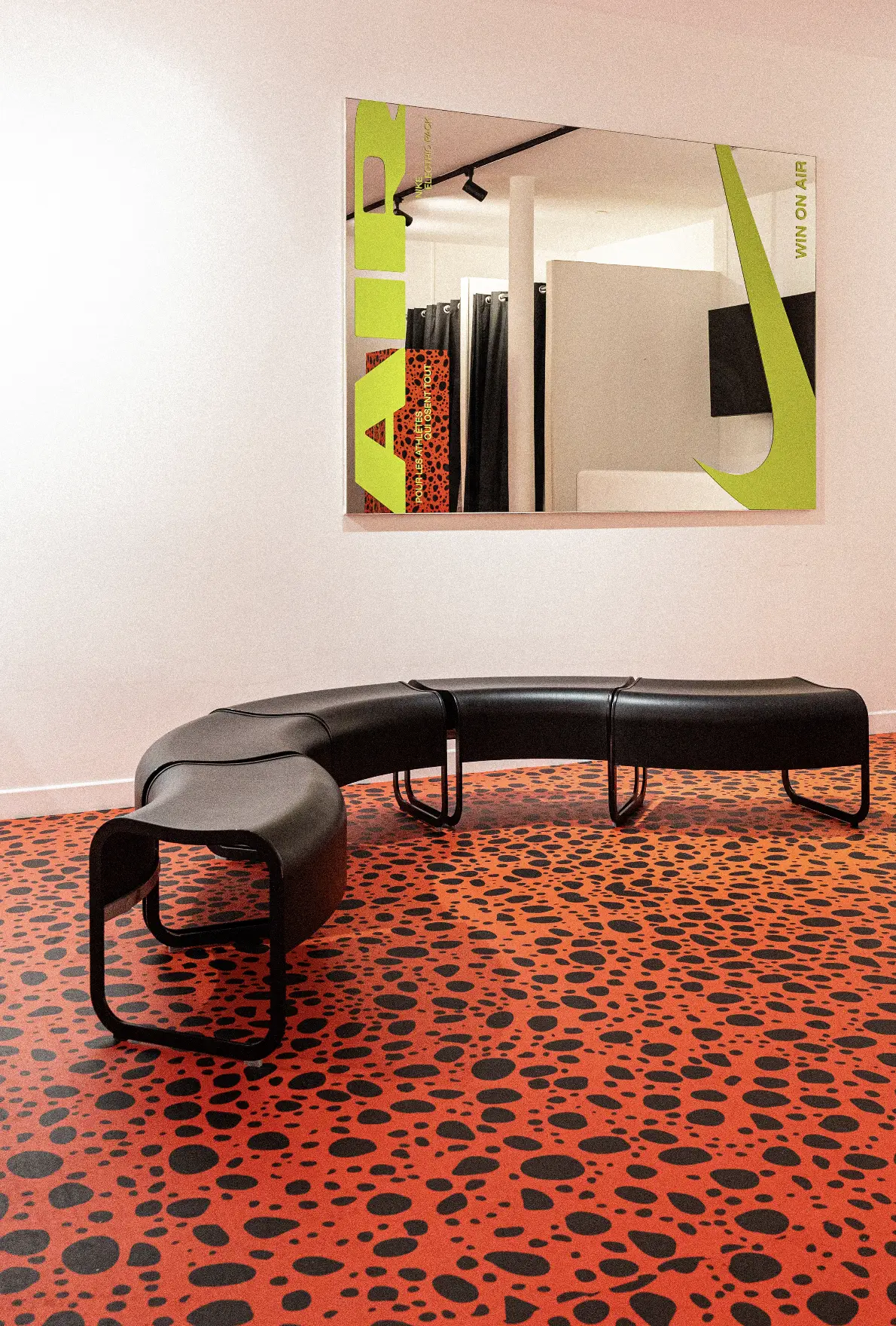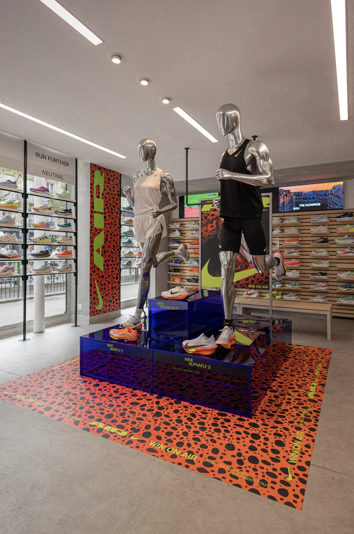 Du sol au plafond, de l’agencement intérieur aux façades extérieures, tout a été repensé aux couleurs de la campagne Nike.