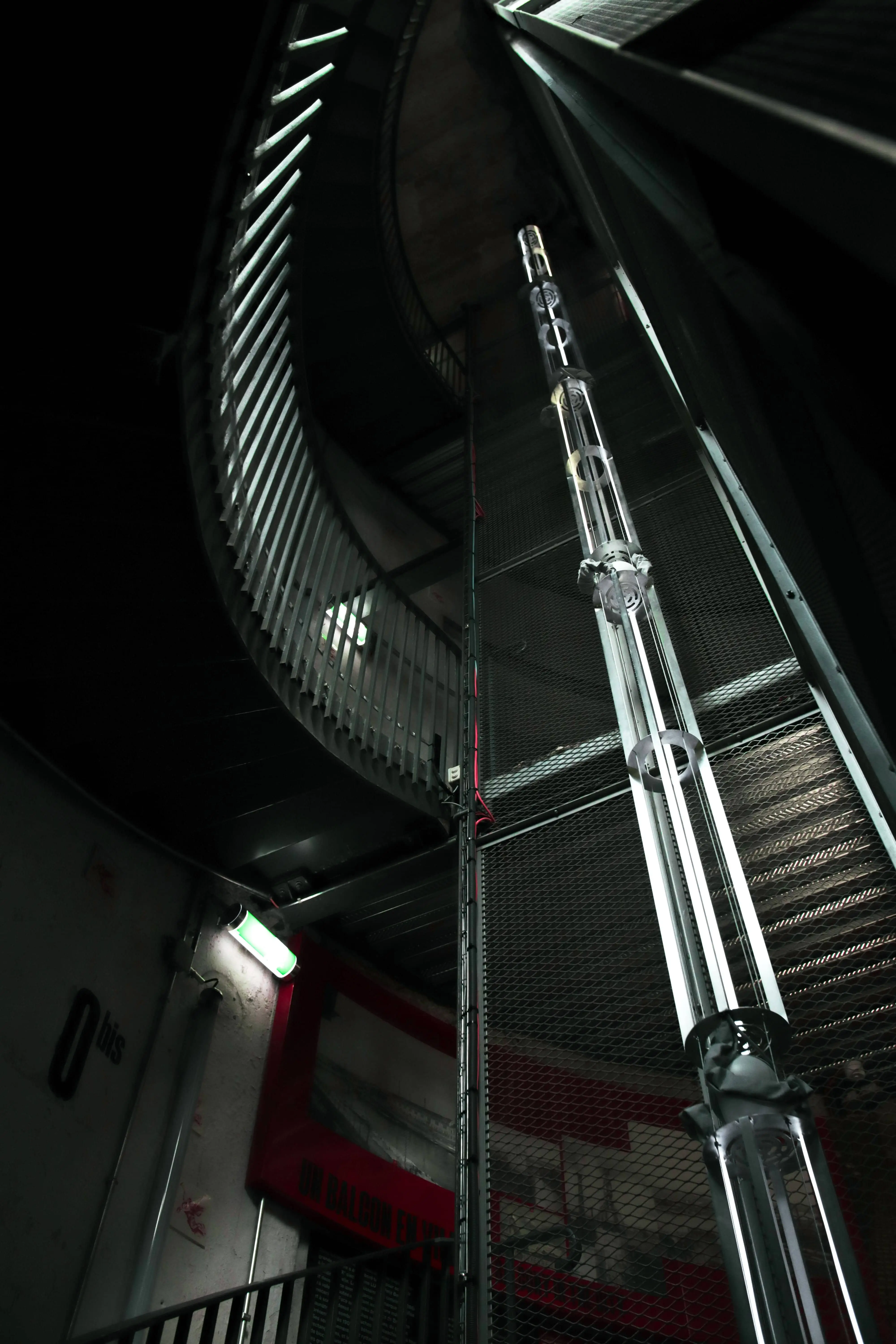 Deux lignes de lumière, tendues dans l’axe de la tour.